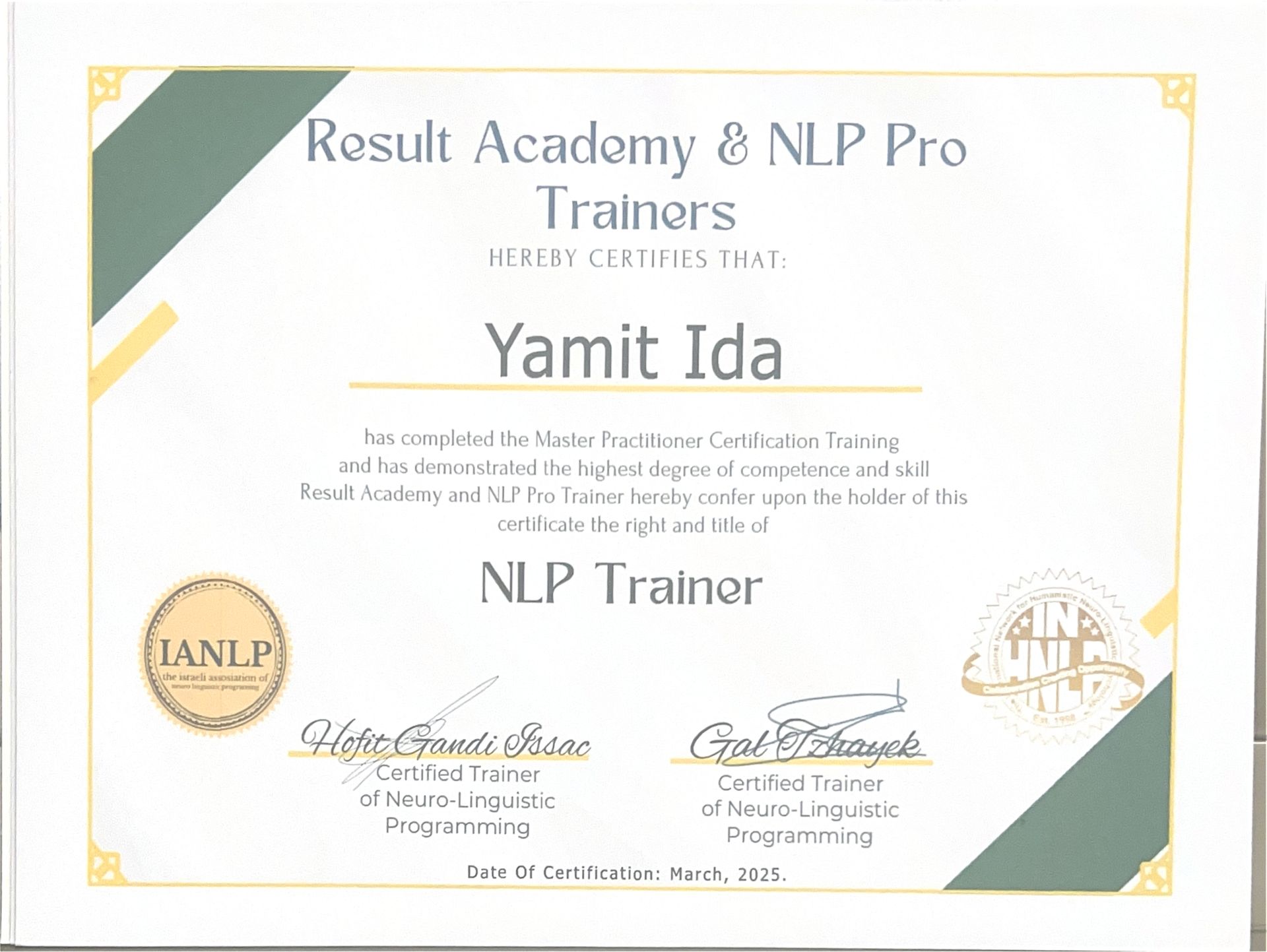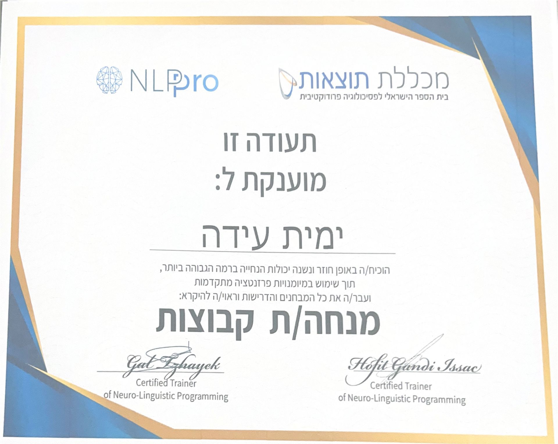 אני מוסמכת NLP TRAINER ומנחת קבוצות.
